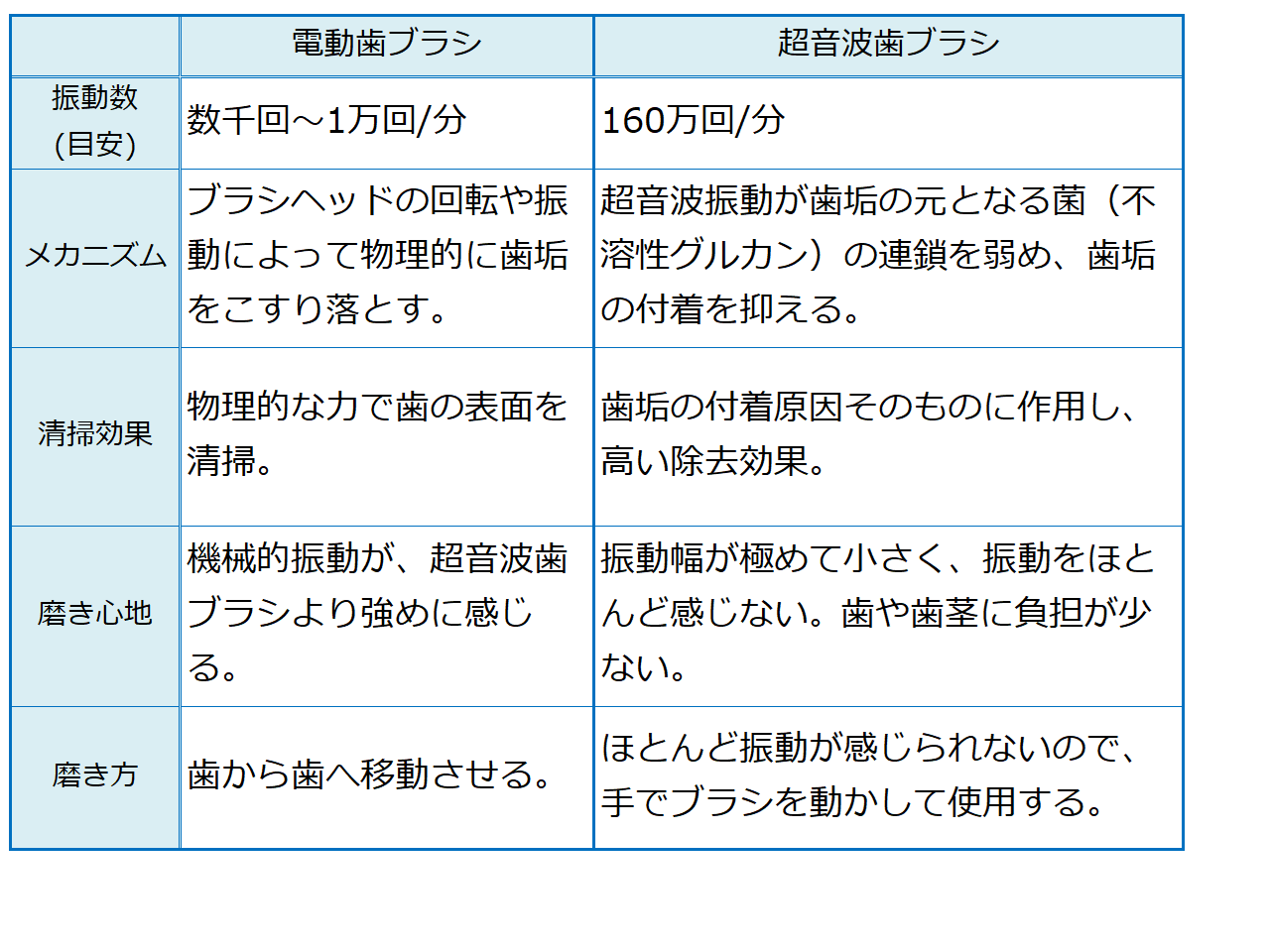 電動歯ブラシと超音波歯ブラシの主な違いは、振動のメカニズムと振動数にあります。超音波歯ブラシは特にその極めて高い振動数と、超音波による作用が最大の特長です。