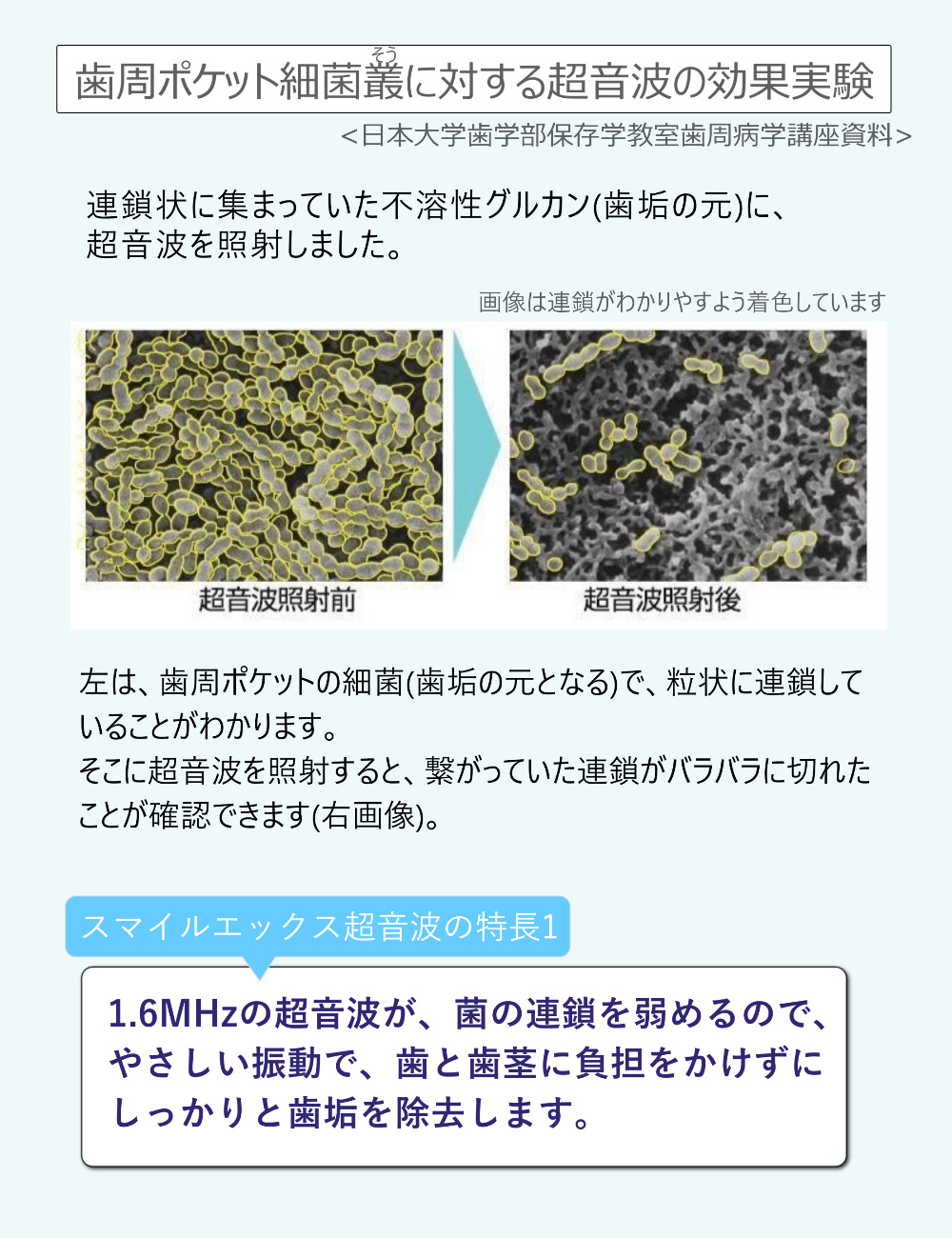 ■1.6MHzの超音波は、骨の再生や止血にも有効とされています。また、『日本歯科保存学会誌』の論文においても、むし歯菌や歯垢の除去への有効性が証明されています。 -