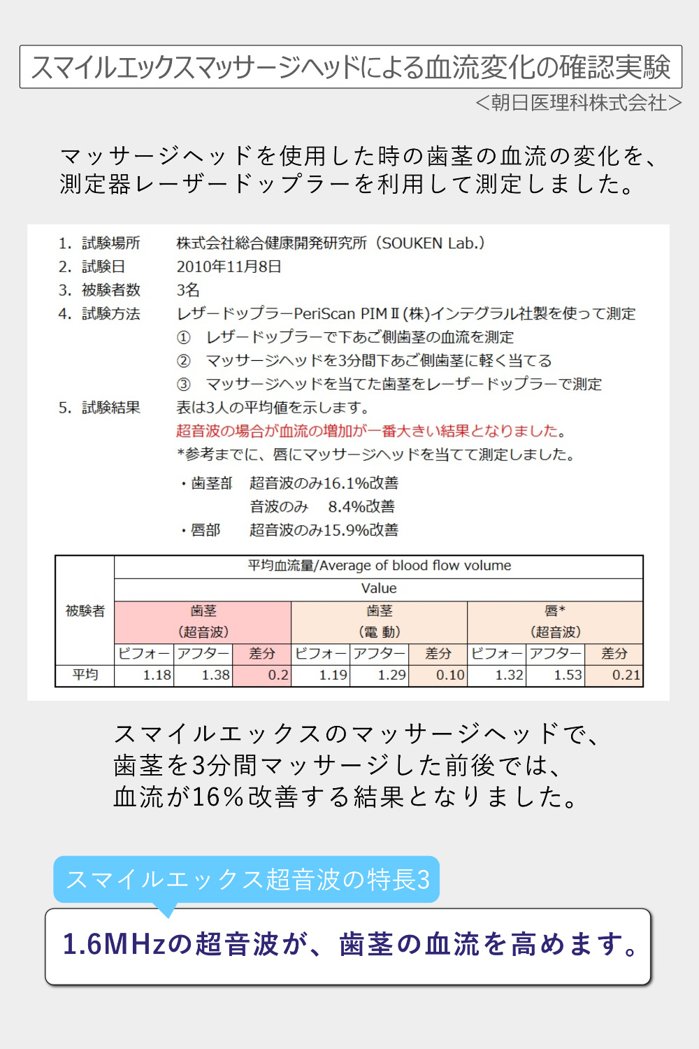 マッサージヘッド使用前後の歯茎の血流の変化について測定しました。歯茎を3分間マッサージした結果、血流が16%高まる結果となりました。
