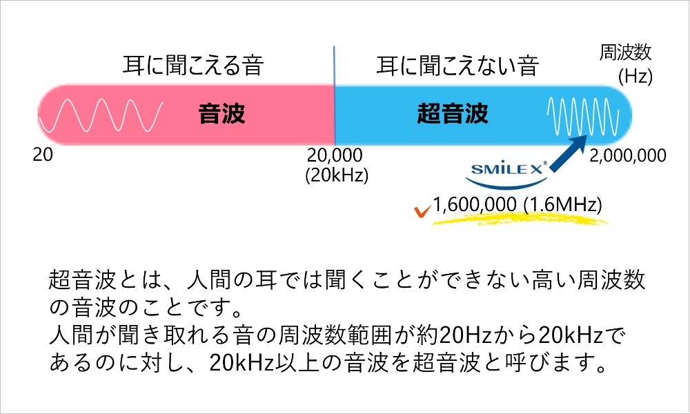超音波とは人間の耳に聞こえない2万Hz以上の音波です。電磁波とは異なり、気体<液体<固体の順に伝達しやすく、皮下深くにエネルギーを浸透させることができるという特徴があります。